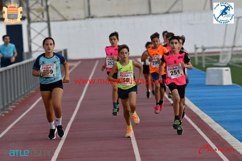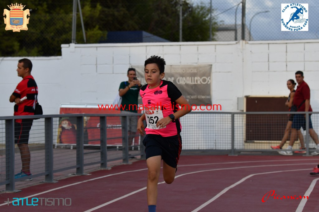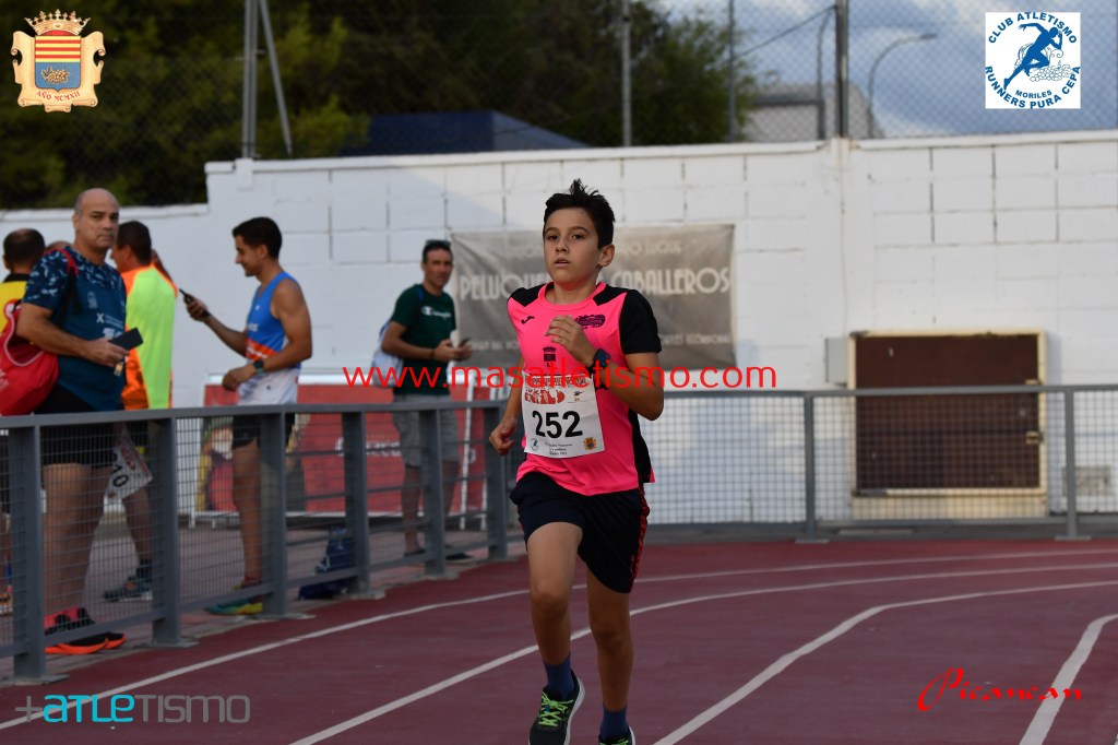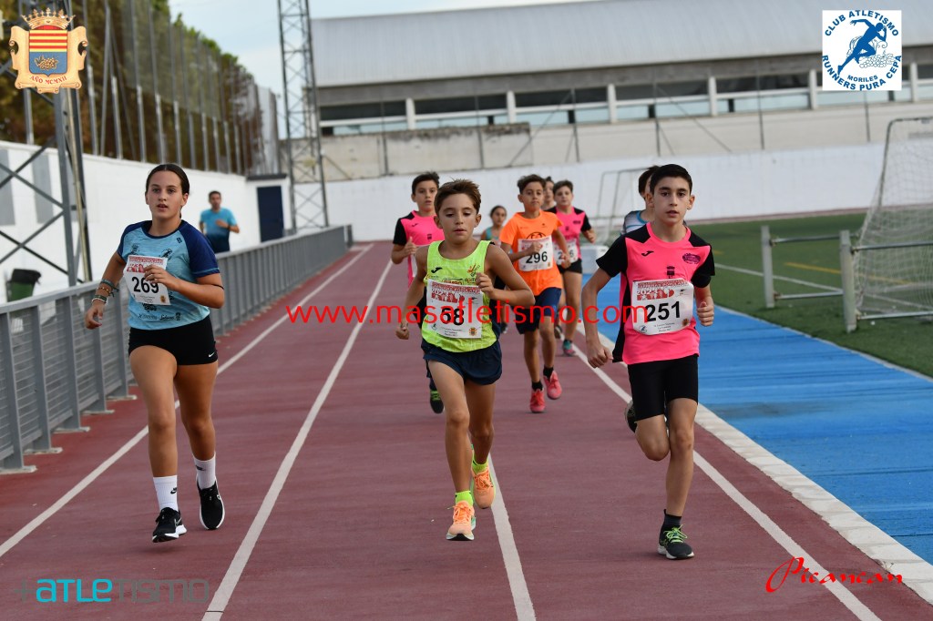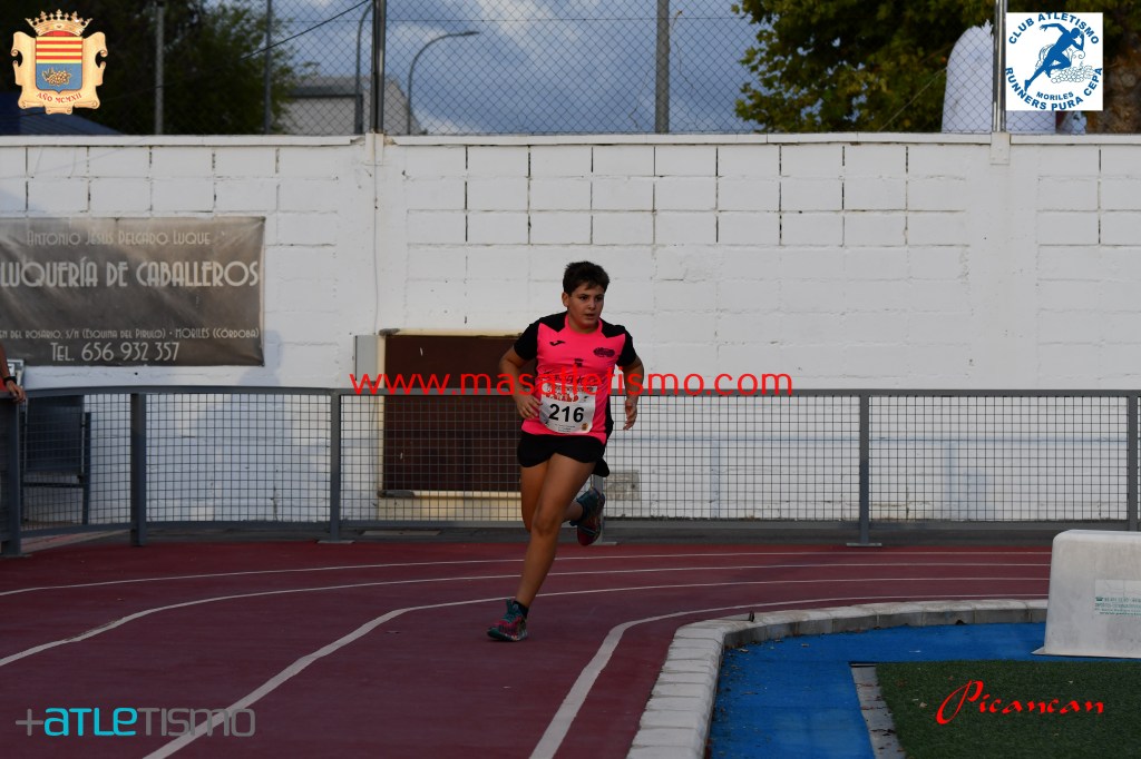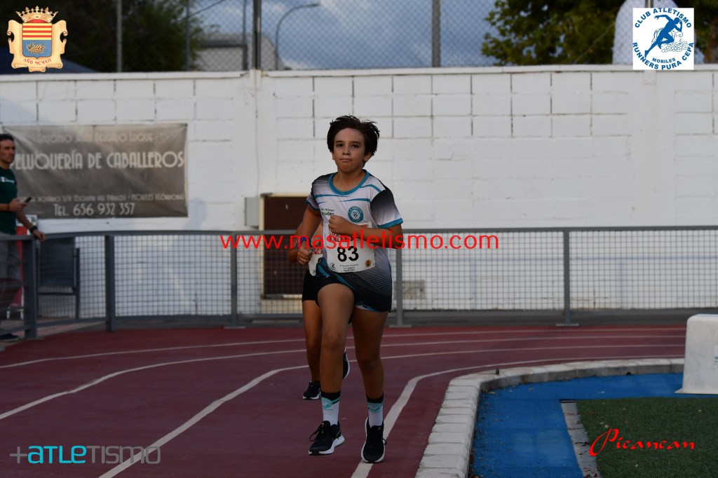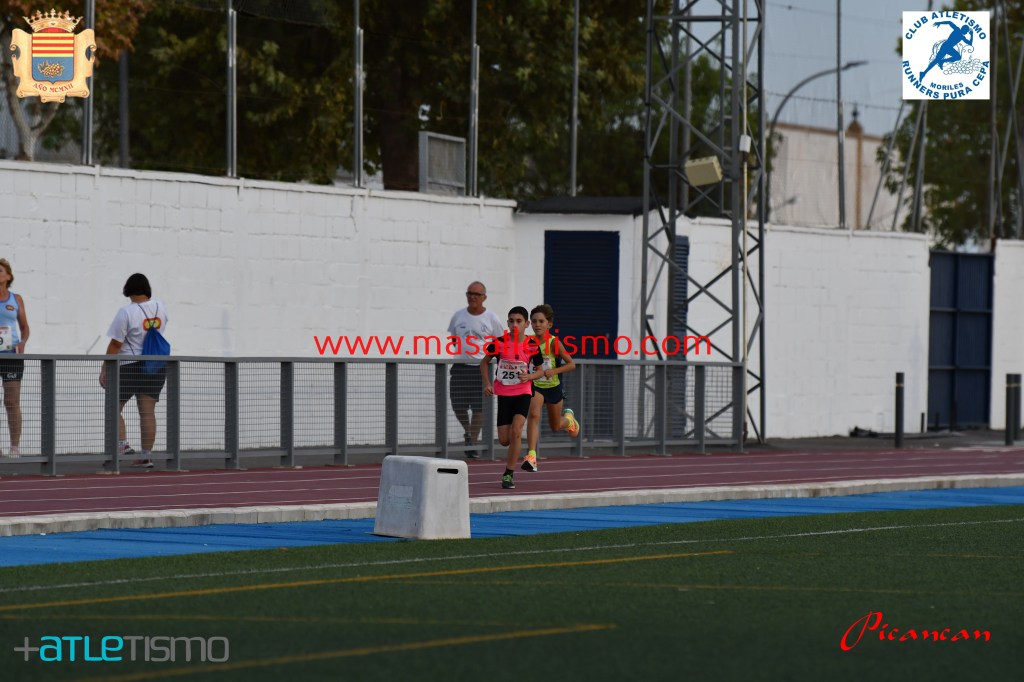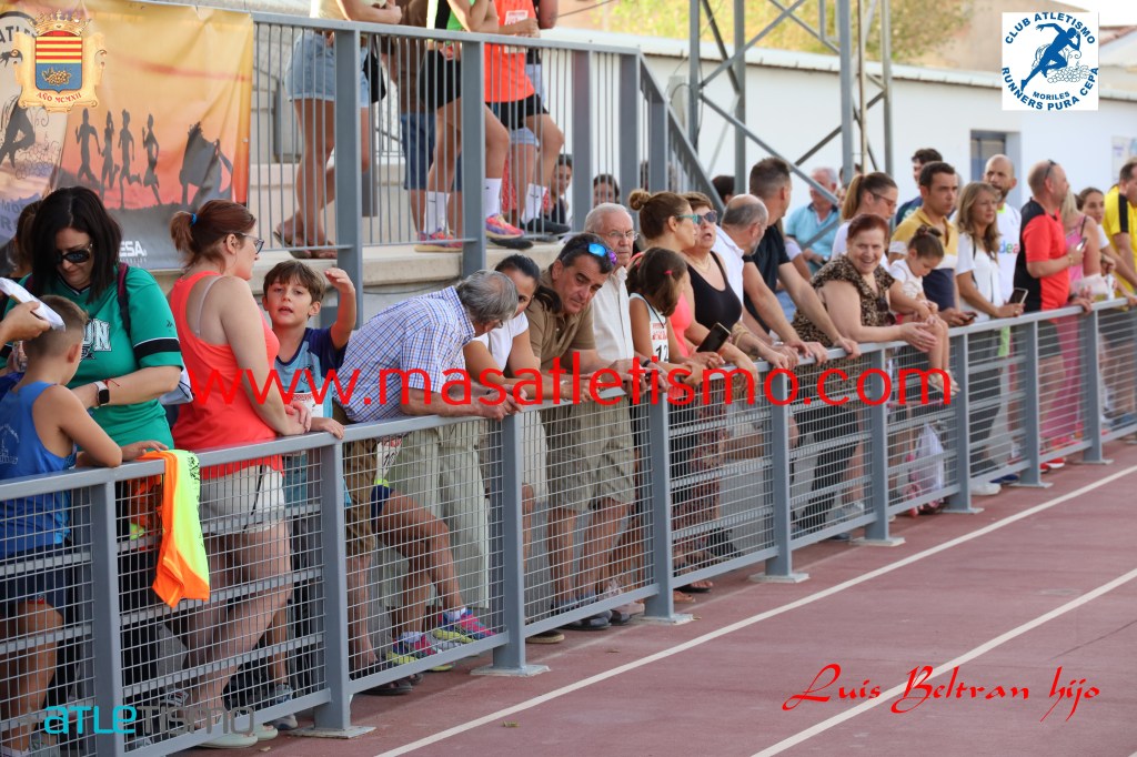 Una grada repleta y bastante publico en la calles de Moriles para seguir las evoluciones de los participantes de la Carrera reina y la de los pequeños en las pistas de atletismo de la localidad.