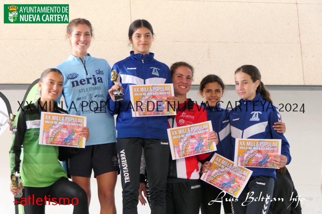 Interesante Milla Élite femenina en la que María del Mar Marqué, dejó su sello con un triunfo cómodo casi desde el inicio. La atleta que llegaba tras su triunfo el día de antes en la carrera popular de Ochavillo del Río, no tuvo en esta ocasión rivales que pudieran malograr un triunfo incontestable. la segunda plaza e la general fue para joven atletas del Cordobés, Ariadna Carrasco, era segunda en Ochavillo y quedaba segunda en esta prueba. Saray Romero atleta del Trotasierra, era la tercera en entrar meta. Cuarta posición para Rocío Marqués de Los Califas, quinta para Arantxa Murillo del Trotasierra, sexta por escasísima diferencia entró Araceli Osuna de Trotasierra y con la séptima clasificada fue Blanca Sánchez. Los jueces marcaron un segundo de diferencia de Osuna sobre Sánchez.