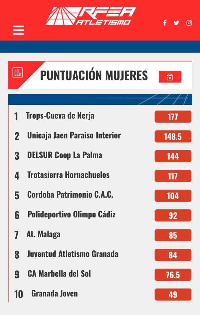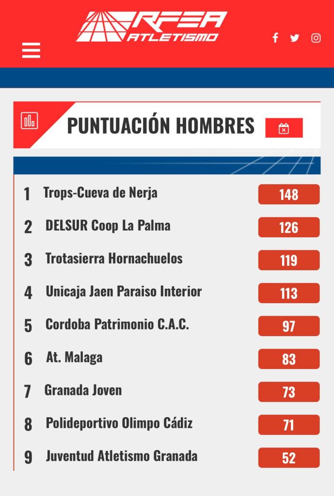 El gran dominador del campeonato fue el 𝐓𝐫𝐨𝐩𝐬-𝐂𝐮𝐞𝐯𝐚 𝐝𝐞 𝐍𝐞𝐫𝐣𝐚, que se proclamó campeón en ambas categorías (masculina y femenina), confirmando su hegemonía en el atletismo andaluz Sub20.
